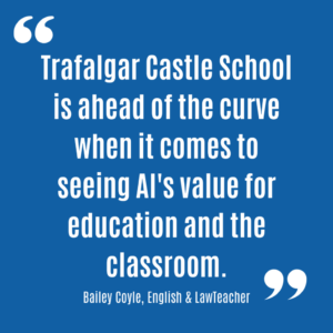 “I feel Trafalgar Castle School is ahead of the curve when it comes to seeing AI’s value for education and the classroom.” she says, “Teaching students the tools they need to work with AI as a support, but also recognizing its limitations, allows our students to work with AI in an informed manner. Our students use critical thinking to evaluate information, judge its reliability, relevance, and usefulness, and think twice about the information presented. Learning not to trust AI at face value is important for maximizing its use.”
